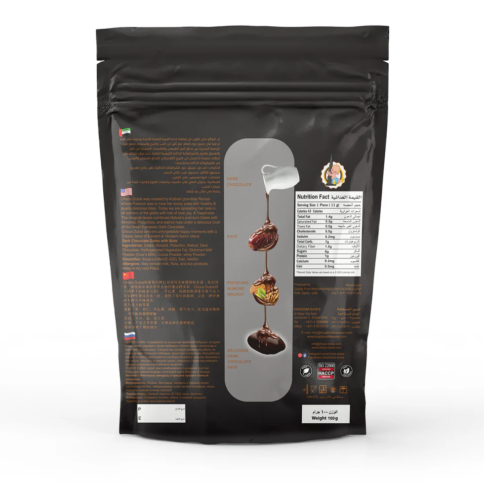 Packaged in a 100g premium box, these dark chocolate-coated dates make the perfect gift from Dubai, ideal for special occasions, coffee moments, or as a luxurious everyday snack.