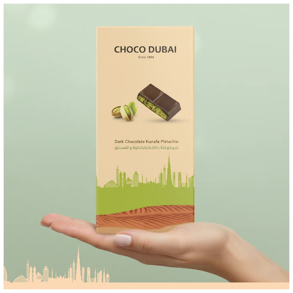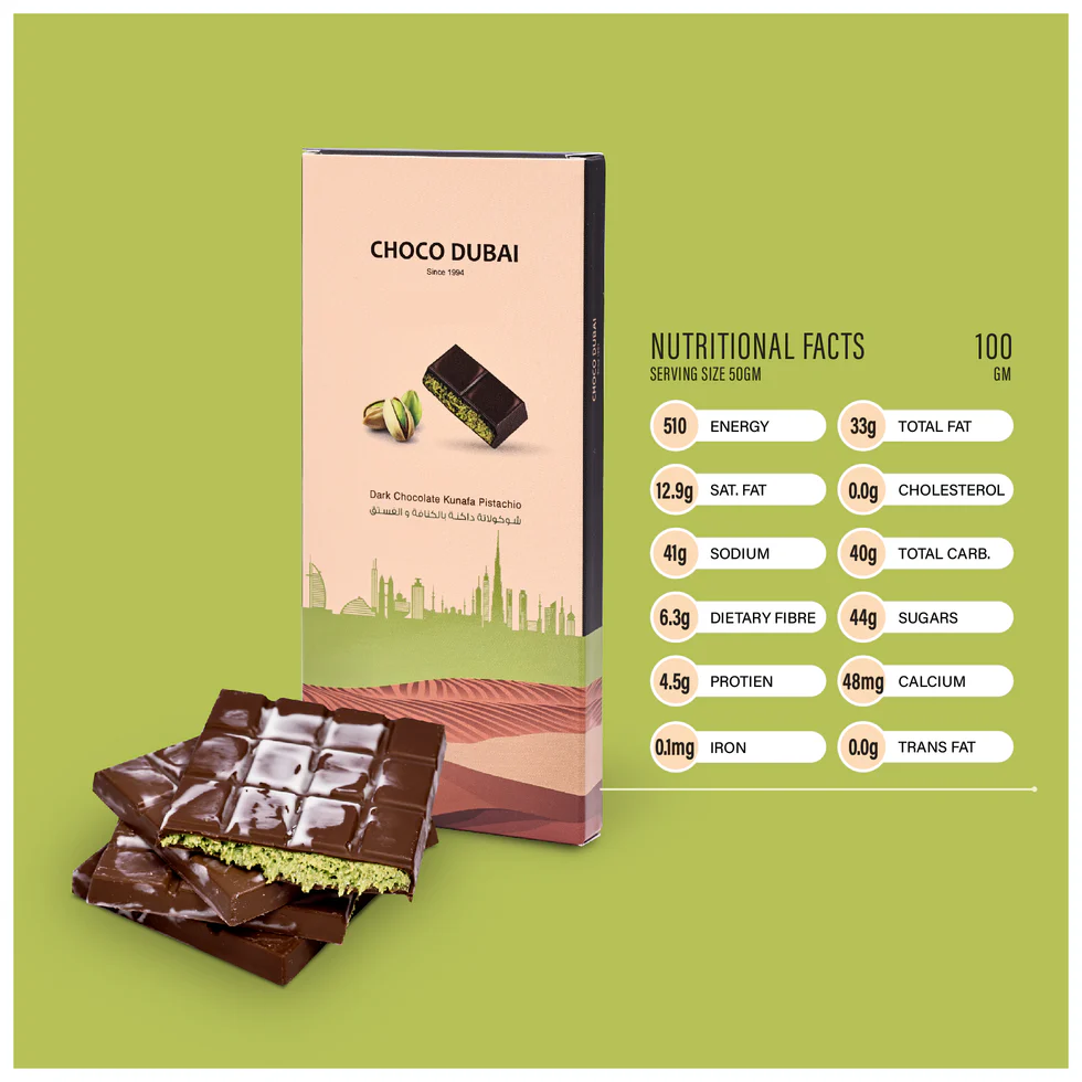 Indulge in the rich taste of Dark Chocolate Kunafa Pistachio – 100 GM, a perfect blend of Middle Eastern tradition and modern gourmet chocolate. Each bite combines smooth dark chocolate, a layer of crispy kunafa, and a creamy pistachio filling, creating a unique flavor experience.
